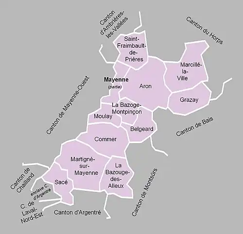 À la suite du redécoupage des cantons pour 2015, les communes d'Aron, La Bazoge-Montpinçon, Belgeard, Commer, Grazay, Marcillé-la-Ville, Martigné-sur-Mayenne, Moulay et Saint-Fraimbault-de-Prières sont rattachées au canton de Lassay-les-Châteaux, la commune de La Bazouge-des-Alleux à celui d'Évron, la commune de Mayenne entièrement à celui de Mayenne et la commune de Sacé à celui de Bonchamp-lès-Laval.