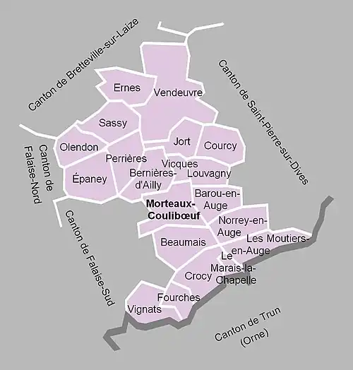 À la suite du redécoupage des cantons pour 2015, toutes les communes à l'exception de Vendeuvre sont rattachées au canton de Falaise. La commune de Vendeuvre est intégrée au canton de Livarot.