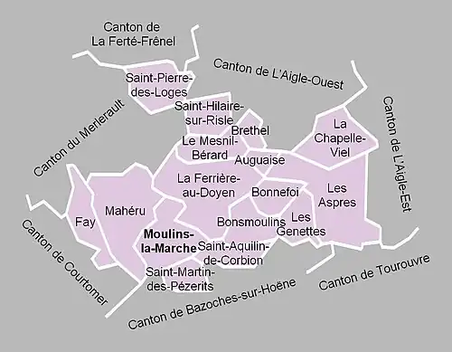 À la suite du redécoupage des cantons pour 2015, les communes de Saint-Aquilin-de-Corbion et Saint-Martin-des-Pézerits sont rattachées au canton de Mortagne-au-Perche, les communes de Fay, Mahéru et Saint-Pierre-des-Loges à celui de Rai et les communes des Aspres, Auguaise, Bonnefoi, Bonsmoulins, Brethel, La Chapelle-Viel, La Ferrière-au-Doyen, Les Genettes, Le Ménil-Bérard, Moulins-la-Marche et Saint-Hilaire-sur-Risle à celui de Tourouvre.