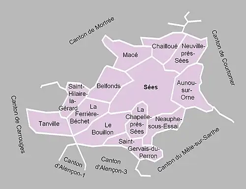 Les anciennes communes suivantes étaient incluses dans le territoire du canton de Sées antérieur à 2015[21] :