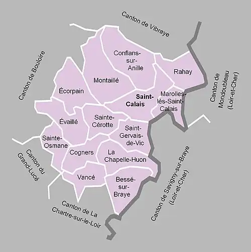À la suite du redécoupage des cantons pour 2015, toutes les communes sont à nouveau rattachées au canton de Saint-Calais auquel s'ajoutent les huit communes du canton de Bouloire, les neuf du canton de Montmirail (Sarthe) et les six du canton de Vibraye.