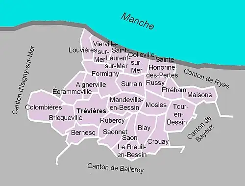Les anciennes communes suivantes étaient incluses dans le territoire du canton de Trévières antérieur à 2015[27] :