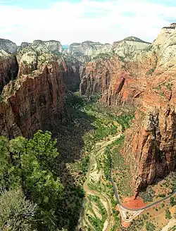 Géologiquement, Zion Canyon fait partie du plateau de Colorado de grès Navajo, qui contenait de nombreux joints et fissures lors de son premier soulèvement, dont l'un a été coupé par la fourche nord de la rivière Virgin pour devenir le canyon de Zion. La rivière a été la plus grande force dans la coupe du canyon, principalement par des crues soudaines, car le débit moyen de la rivière est très léger. Cette baisse relativement rapide a laissé de nombreux affluents saisonniers avec des vallées suspendues.