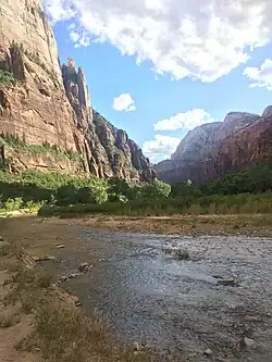 Le début du canyon est généralement délimité comme le Sinawava Temple, un amphithéâtre naturel à parois verticales de près de 910 mètres de profondeur. Le canyon commence cependant beaucoup plus en amont et s'étend vers le sud sur environ 26 kilomètres à travers les Narrows pour atteindre le Temple. La gorge passe ensuite au sud-ouest à travers le parc national, approchant les 610 mètres de profondeur par endroits. Alors que le bord du canyon est dominé par le désert, le fond du canyon supporte une forêt et une zone riveraine arrosée par la rivière North Fork Virgin. La gorge fusionne ensuite avec Pine Creek Canyon alors qu'elle sort du parc national et passe devant la communauté de Springdale. La fin du canyon est l'endroit où il rencontre la rivière Virgin, à environ 160 km au nord-est du lac Mead, dans lequel la rivière se jette finalement [2], [3].