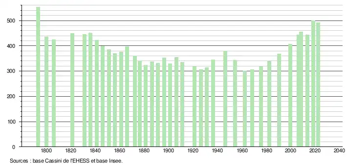 L'évolution du nombre d'habitants est connue à travers les recensements de la population effectués dans la commune depuis 1793. Pour les communes de moins de 10 000 habitants, une enquête de recensement portant sur toute la population est réalisée tous les cinq ans, les populations de référence des années intermédiaires étant quant à elles estimées par interpolation ou extrapolation[31]. Pour la commune, le premier recensement exhaustif entrant dans le cadre du nouveau dispositif a été réalisé en 2008[32].