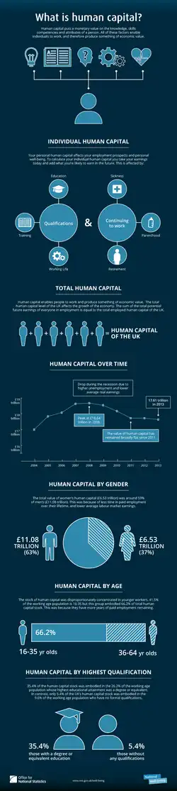 Au début des années 2000, le capital humain est défini comme un ensemble « de connaissances, de qualifications, de compétences et de caractéristiques individuelles qui facilitent la création de bien-être personnel, social et économique. »[5]