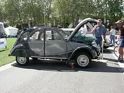 Une Citroën DS avec son capot moteur ouvert, montrant ainsi sa roue de secours.