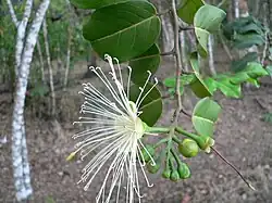 Les fleurs disposées en corymbes sont odorantes. Elles possèdent 4 sépales cupuliformes et 4 pétales blancs, coriaces, de 13-15 mm et de nombreuses étamines 3 fois plus longues que les pétales.
