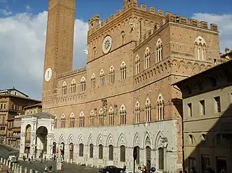 La Cappella di Piazza fut ajoutée par les Siennois au pied de la tour Torre del Mangia en offrande à la Vierge Marie en remerciement de les avoir libérés de la peste noire.