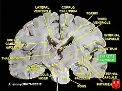 La capsule extrême (en latin : capsula extrema) est un ensemble de tractus de fibres blanches (formées d'axones) situées entre le claustrum (appelé également l'avant-mur) et le cortex insulaire[1]. Cette capsule extrême est aussi décrite comme une fine capsule de substance blanche en tant que fibres d'association (en) corticocorticales (c'est-à-dire que ces fibres sont responsables de relier le cortex cérébral avec une autre aire corticale)[2]. La capsule extrême est séparée de la capsule externe par le claustrum, et la capsule extrême sépare le claustrum du cortex insulaire, et tous ces éléments se trouvent latéraux par rapport aux composants du corps strié[2],[3].