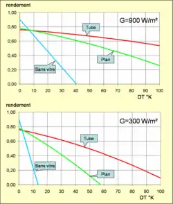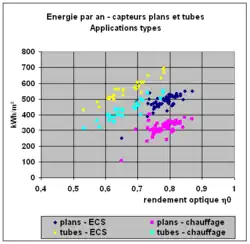 Les valeurs typiques en 2011-2012 pour les capteurs vitrés et à tubes[26] du laboratoire suisse SPF (Solartechnik Prüfung Forshung) sont les suivantes (pour les surfaces d’absorbeur) :