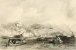 Le , les HMS Wellesley (en), Conway (en), Alligator (en), et Rattlesnake arrivent au large du port de Chusan[4]. Dans l'après-midi, le capitaine John Vernon Fletcher du Wellesley, le secrétaire militaire Lord Robert Jocelyn, et l'interprète Karl Gützlaff sont envoyés à bord de la jonque d'un amiral chinois, également gouverneur des îles Chusan[5],[6]. Ils remettent un message écrit du commodore Gordon Bremer (en), commandant en chef des forces navales britanniques, et du général George Burrell (en), commandant en chef des forces terrestres, demandant de céder l'île de Chusan[7]. Bremer et Burrell affirment que l'occupation est nécessaire après la « conduite insultante et injustifiable » des hauts fonctionnaires de Canton, Lin Zexu et Deng Tingzhen (en), l'année dernière envers le surintendant principal Charles Elliot et les sujets britanniques[8]. Une partie du message indique :