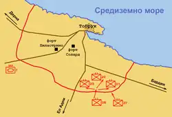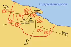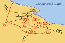Le matin du 5 janvier, alors que les forces australiennes nettoyaient toujours la zone sud de Bardia, Wavell ordonna à la 7e brigade blindée de la 7e division blindée d'avancer vers l'ouest, de passer Tobrouk afin d'isoler la ville. Le 6 janvier, la brigade avait atteint El Adem (aujourd'hui l'aéroport de Tobrouk). Le 7 janvier, le gros des forces britanniques était arrivé et avait isolé Tobrouk[4]. Le groupe de la 19e brigade australienne se plaça en face des défenses orientales de Tobrouk tandis que le groupe de la 16e brigade australienne prit le relais du côté ouest. La 4e brigade blindée fut déployée vers l'ouest de la ville, le 7e groupe de soutien bloqua les sorties ouest et la 7e brigade blindée protégea la force des interférences de l'ouest.
