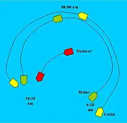 L' Unión a hissé le drapeau péruvien et a tiré un coup à blanc, en réponse à un tir du Rímac, qui était très court, puisque sa portée n'était que de 810 m. Les marins du Rímac, pour la plupart étrangers, se sont précipités à la cantine voulant enfoncer la porte, mais les Carabineros de Yungay sont intervenus pour imposer l'ordre.