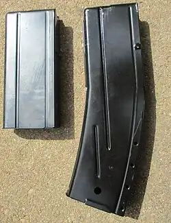 La M1 utilise un magasin amovible droit de quinze cartouches, dont la masse chargé est de 268 g[52]. Un chargeur incurvé de trente cartouches est introduit à la fin de l’année 1944 en même temps que la M2. Celui-ci est également compatible avec la M1, mais, du fait de son poids plus important, cela peut à long terme endommager le système de rétention du magasin[14]. Une poche contenant deux chargeurs peut être attachée à la crosse de l’arme, ce qui permet aux troupes de soutien de ne pas s’encombrer d’un ceinturon porte-chargeur, les quarante-cinq cartouches emportées de cette manière étant suffisantes pour leur usage[52].