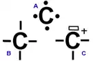 Au niveau du carbone chargé la molécule a une structure plane avec des angles de valence de 120°. Le carbone chargé est lié au reste de la molécule par trois liaisons , et possède donc une orbitale atomique 2pz vide, il est donc hybridé sp² (voir le schéma).