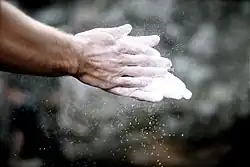 Sous forme de poudre appelée couramment « magnésie », le carbonate de magnésium est utilisé dans certains sports comme la gymnastique artistique, l'escalade ou l'haltérophilie pour assécher les mains[5]. La formule de cette poudre est plus précisément (MgCO3)4Mg(OH)25H2O[6]. Elle peut contenir une faible proportion de silice qui, inhalée, peut avoir des effets sur les poumons.[réf. nécessaire]En conséquence, pour des raisons d'hygiène et de sécurité sanitaire, l'utilisation de magnésie dite « liquide » est aujourd'hui courante. Ce produit est en réalité un mélange d'eau, d'alcool (éthylique ou isopropylique) et de carbonate de magnésium.