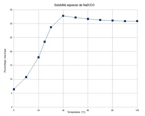 La solubilité du carbonate de sodium dans l'eau croît avec la température, jusqu'à 33 % en masse à 40 °C, puis décroît au-delà, pour tendre vers une valeur légèrement inférieure, à 30 % en masse. La solubilité à saturation pour 100 g d'eau pure est de 7,1 g à 0 °C, de 45,5 g à 100 °C.