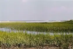 Les marais, écosystèmes intertidaux dominés par la végétation herbacée, se trouvent des côtes de l'Arctique à celles des régions subtropicales tandis que sous les tropiques, les mangroves dominent[17]. Les marais ont une productivité élevée, avec une grande partie de la production primaire de biomasse souterraine. Cette biomasse souterraine peut former des dépôts jusqu'à 8 m de profondeur. Les marais offrent un habitat précieux aux plantes, aux oiseaux et aux alevins, protègent l'habitat côtier des ondes de tempête et des inondations et peuvent réduire la charge en nutriments dans les eaux côtières[18]. À l'instar des mangroves et des herbiers marins, les marais salés constituent également d'importants puits de carbone. Les marais séquestrent le carbone dans la biomasse souterraine en raison des taux élevés de sédimentation organique et de décomposition anaérobie[19]. Les marais salés couvrent environ 22 000 à 400 000 km 2 dans le monde, avec un taux d'enfouissement du carbone estimé à 210 g de carbone par m 2 et par an. Les marais maritimes ont été gérés par les humains pendant des siècles, pour le pâturage, la fenaison, l'agriculture, le développement et les ports, les bassins d'évaporation pour la production de sel, l'aquaculture, la lutte contre les insectes, l'énergie marémotrice et la protection contre les inondations[20]. Les marais sont également sensibles à la pollution par le pétrole, les produits chimiques industriels et, le plus souvent, à l'eutrophisation. Les espèces introduites, l'élévation du niveau de la mer, les barrages et la diminution de la sédimentation sont des changements à long terme qui affectent l'habitat des marais et, à leur tour, peuvent affecter leur potentiel de séquestration du carbone[21].
