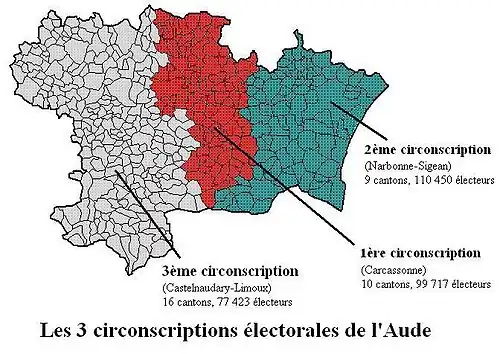 Malheureusement de nombreux problèmes causent la perte de cette mono-industrie. À la Révolution française, la ville est peu engagée et l'industrie drapière est concurrencée par les Anglais, provoquant des baisses de salaires importantes. Le , le département de l'Aude est créé, et Carcassonne en devient le chef-lieu[78]. Elle devient aussi chef-lieu de district. Mais les prix de la nourriture augmentent, la famine et le mécontentement populaire se font sentir.