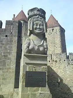 Carcassonne entretient une légende totalement infondée, datant du XVIesiècle[62], selon laquelle le nom de la ville daterait du début du IXesiècle, au moment où elle aurait été sarrasine. Charlemagne en aurait fait le siège, mais la maîtresse des lieux, Dame Carcas, aurait fort résisté. Les assiégés étant au bord de la famine, il ne serait resté qu'une mesure de blé et un petit cochon dans la cité. Dame Carcas aurait eu l'idée de démoraliser ses adversaires: le porcelet aurait été engraissé puis projeté par-dessus les remparts, laissant penser que la ville avait encore beaucoup de nourriture. Charlemagne aurait alors fait lever le siège. À ce moment, dame Carcas aurait fait sonner les trompettes (ou les cloches des églises) et, Charlemagne revenant sur ses pas, la dame Carcas lui aurait proposé la paix. D'où l'expression «Carcas sonne».