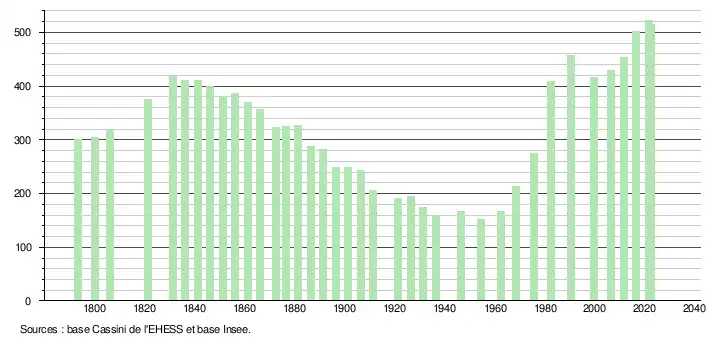 L'évolution du nombre d'habitants est connue à travers les recensements de la population effectués dans la commune depuis 1793. Pour les communes de moins de 10 000 habitants, une enquête de recensement portant sur toute la population est réalisée tous les cinq ans, les populations de référence des années intermédiaires étant quant à elles estimées par interpolation ou extrapolation[37]. Pour la commune, le premier recensement exhaustif entrant dans le cadre du nouveau dispositif a été réalisé en 2006[38].