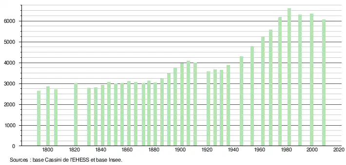 - ↑ Dans le tableau des recensements et le graphique, par convention dans Wikipédia, le principe a été retenu, pour les populations légales postérieures à 1999 de n’afficher dans le tableau des recensements et le graphique que les populations correspondant à l'année 2006, première population légale publiée calculée conformément aux concepts définis dans le décret no 2003-485 du 5 juin 2003, et les années correspondant à une enquête exhaustive de recensement pour les communes de moins de 10 000 habitants, ainsi que la dernière population légale publiée par l’Insee.