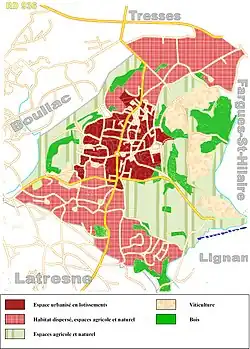 Le PLU a classé en zones U (c'est-à-dire urbanisables) 307 ha et en zone AU une cinquantaine d’hectares qui pour moitié peuvent s’ouvrir assez rapidement à l’urbanisation. Au total, 40 % environ de la commune est potentiellement constructible.