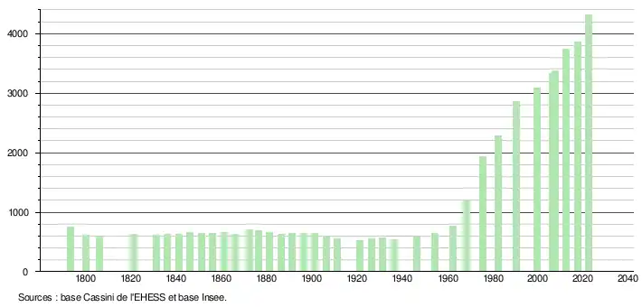 L'évolution du nombre d'habitants est connue à travers les recensements de la population effectués dans la commune depuis 1793. Pour les communes de moins de 10 000 habitants, une enquête de recensement portant sur toute la population est réalisée tous les cinq ans, les populations de référence des années intermédiaires étant quant à elles estimées par interpolation ou extrapolation[30]. Pour la commune, le premier recensement exhaustif entrant dans le cadre du nouveau dispositif a été réalisé en 2007[31].