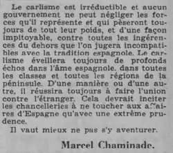 Après la signature de la convention d’Ognate, le carlisme, bien que réduit à la clandestinité, avait encore de nombreux partisans dans certains milieux. L’écrivain traditionaliste Vicente Marrero soutient qu’il était majoritaire dans la population[85]. Pendant plusieurs années, le journal La Esperanza dirigé par le carliste Pedro de la Hoz (es) fut le périodique le plus diffusé de toute la presse espagnole[86].