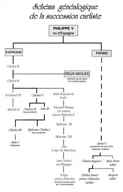 Le carlisme (en espagnol : carlismo) est un mouvement politique traditionaliste, absolutiste et légitimiste espagnol apparu dans la première moitié du XIXe siècle en réaction au libéralisme, au parlementarisme et au sécularisme, qui revendique le trône pour une branche alternative de la dynastie des Bourbons[1],[2]. À ses origines, il défendait le retour à l'Ancien Régime espagnol (es). Il développa par la suite une doctrine politique inspirée de la tradition espagnole et de la chrétienté médiévale[3],[1],[4]. Le carlisme fut à l'origine de plusieurs guerres civiles qui déchirèrent le XIXe siècle espagnol et marquèrent profondément le pays. Malgré quelques succès militaires, les troupes carlistes ne réussirent pas à prendre le pouvoir à Madrid, qui resta aux mains de la fille aînée de Ferdinand VII, devenue Isabelle II (de 1833 à 1868), puis de son fils Alphonse XII (de 1874 à 1885), et enfin du fils de ce dernier, Alphonse XIII (de 1886 à 1931). Il constitua néanmoins tout au long de son existence l'un des principaux acteurs des luttes de la monarchie et de l’Église contre le libéralisme et le modernisme. Plusieurs mouvements actuels se revendiquent encore comme ses héritiers (Parti carliste, communion traditionaliste carliste, carloctavisme, etc.), mais leur audience est extrêmement réduite.