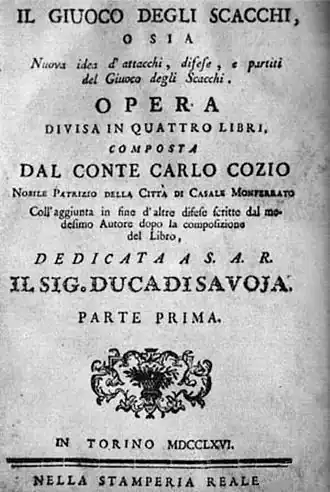Carlo Cozio écrivit un traité en deux volumes sur les échecs de plus de 700 pages, (it) Il giuoco degli scacchi o sia Nuova idea di attacchi, difese e partiti del Giuoco degli Scacchi, 1766 paru à Turin. Lothar Schmid possède un manuscrit daté de 1740 qui pourrait avoir été la base d'une première édition détruite[1].
