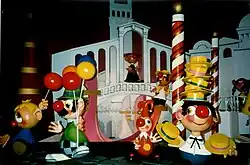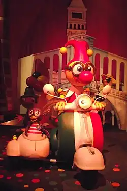 - Italie. Après l’Allemagne et les Alpes, le visiteur se retrouve tout naturellement en Italie. Jokie est aux commandes d'une vespa, certains personnages sont déguisés devant les gondoles de Venise et la tour de Pise.