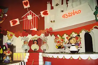 - France. Le parcours se poursuit avec Pigalle et son Moulin Rouge. Devant celui-ci, le visiteur voit trois danseuses de French cancan ainsi qu'un bistro parisien et sa terrasse.