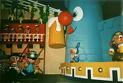 - Scène finale. Une photo des visiteurs y est prise avant qu’un représentant de certains pays rencontrés salue les passagers. Le néerlandais avec Groeten aan de buren (Bonjour aux voisins), l’allemand avec Auf Wiedersehen, le français avec Au revoir, etc.[12],[9]