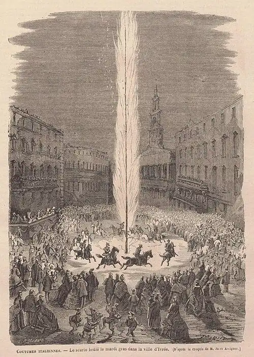Parmi les fêtes carnavalesques de l'Italie, si renommées à l'étranger, et qui ont servi de type, presque partout, aux réjouissances du même genre, il en est une fort connue de ce côté des Alpes ; mais dont la célébrité, à raison de son caractère tout à fait local, est demeurée italienne. Je veux parler du carnaval d'Ivrée.