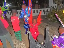 - Lanceurs de cordes : Des gens à demi-nus "avec leur peau luisante couverte d’un mélange de charbon écrasé et de sirop de canne, leurs têtes hérissées de cornes démoniaques, ces deux hommes nous toisent, implacables et altiers... Les cordes qu’ils tiennent entre les mains rappellent les entraves de leurs ancêtres esclaves"[12].