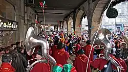 - Les Rambaïurs, bande mixte fondée en 2007 par un groupe d'ami(e)s. Certains de ses fondateurs sont encore des membres actifs. Sa première sortie fut réalisée en 2009 sur une thématique "agence bancaire". Son siège se situe au café Al Limos près de la porte de la Trinité (réaménagée et élargie entre 1775 et 1778). qui s'ouvre sur le cœur de ville en empruntant la rue Jean Jaurès. Parcours de la bande, accompagnée des musiciens, pour rejoindre la place de la République le jour de la sortie. Les membres de la bande portent un costume blanc et bleu, réhaussé par un chapeau cloche bleu. Ils partagent la sortie du samedi avec la bande des Brounzinaïres et s'attachent à présenter un thème très proche de l'actualité qu'elle soit locale, régionale ou nationale. L'essentiel réside à mettre le focus sur un fait et de le tourner en dérision.
