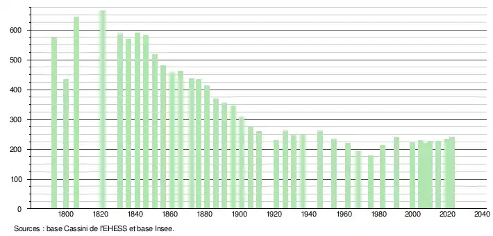 L'évolution du nombre d'habitants est connue à travers les recensements de la population effectués dans la commune depuis 1793. Pour les communes de moins de 10 000 habitants, une enquête de recensement portant sur toute la population est réalisée tous les cinq ans, les populations de référence des années intermédiaires étant quant à elles estimées par interpolation ou extrapolation[29]. Pour la commune, le premier recensement exhaustif entrant dans le cadre du nouveau dispositif a été réalisé en 2004[30].