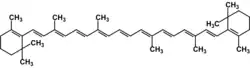 Les deux extrémités de la molécule de β-carotène sont structurellement identiques et sont appelées cycles β. Plus précisément, le groupe de neuf atomes de carbone à chaque extrémité forme un cycle β.