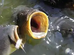 La carpe commune (Cyprinus carpio) est une espèce de poissons téléostéens de la famille des cyprinidés. Le nom de Carpe peut aussi désigner plusieurs formes mutantes, hybrides et d'élevage plus ou moins domestiquées, avec par exemple la carpe cuir, la carpe miroir ou Band-Carp, ou la carpe koï qui est l'une des sous-espèces de poissons les plus anciennement domestiquées[1]. Ces formes mutantes sont plus ovoïdes, au dos bossu et au ventre flasque, et caractérisées par des anomalies d'écaillures.
