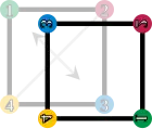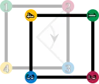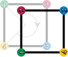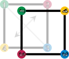Les éléments du groupe de symétrie (D4). Les sommets sont colorés et numérotés uniquement pour visualiser les transformations.