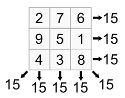 Les sommes des deux carrés magiques des mêmes ordres donnent également des carrés magiques[8], mais le résultat n'est pas normal, c'est-à-dire que les nombres ne forment pas la suite 1, 2, 3... Également, la différence de deux carrés magiques du même ordre donne également un carré magique, mais qui n'est pas normal.