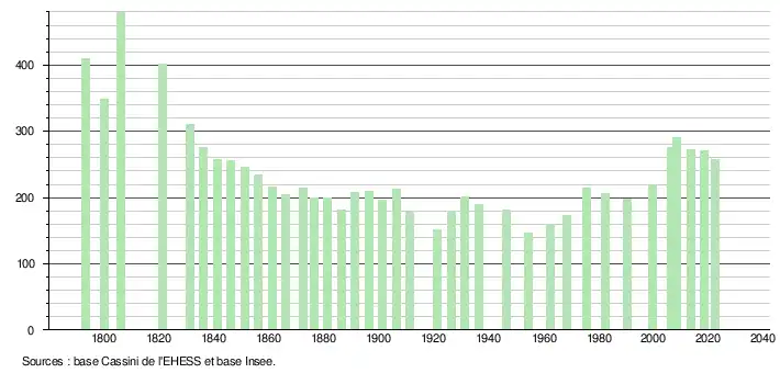 L'évolution du nombre d'habitants est connue à travers les recensements de la population effectués dans la commune depuis 1793. Pour les communes de moins de 10 000 habitants, une enquête de recensement portant sur toute la population est réalisée tous les cinq ans, les populations de référence des années intermédiaires étant quant à elles estimées par interpolation ou extrapolation[21]. Pour la commune, le premier recensement exhaustif entrant dans le cadre du nouveau dispositif a été réalisé en 2008[22].