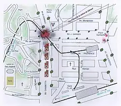 - ↑ Ces tirs d'obus éventraient de nombreux commerces et les étages supérieurs d'immeubles mais ne faisaient pas de victime dans les maisons atteintes, la population ayant pris l'habitude, dans ce cas, de s'abriter dans les caves.