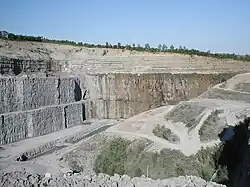 - Carrières à ciel ouvert, soit « à flanc de coteau » ou « à flanc de falaise » (carrières littorales)[10], soit « en fosse » (jusqu'à une centaine de mètres de profondeur parfois).