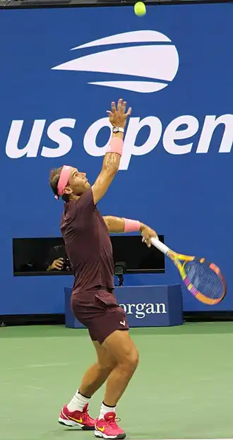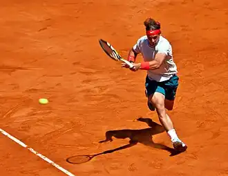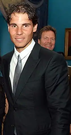Rafael Nadal Parera est un joueur de tennis espagnol né le à Manacor, sur l'île de Majorque, en Espagne. Il commence sa carrière professionnelle en 2001[1] à la 1002e place. Puis, en une même année (2003[1]), il entre successivement dans le top 100 puis dans le top 50. Après avoir été classé au second rang mondial durant 160 semaines consécutives, il devient no 1 mondial le jusqu'au , puis du jusqu'au et encore en , et de nouveau fin , ou début décembre, il cumule 201 semaines à la tête du classement ATP, se plaçant ainsi à la septième place sur le plan de la longévité, derrière Connors et devant McEnroe. Il compte notamment vingt deux titres du Grand Chelem, record absolu chez les hommes, (quatorze à Roland-Garros, deux à Wimbledon, quatre à l'US Open, deux à l'Open d'Australie) et trente-cinq ATP Masters 1000. En juin 2022, sa victoire à l'open de France, lui permet d'établir son compteur de titres ATP à 91.