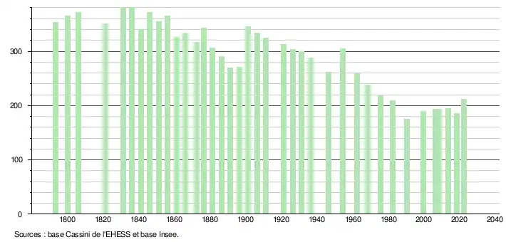 - ↑ Fiches Insee - Populations de référence de la commune pour les années 2006, 2007, 2008, 2009, 2010, 2011, 2012, 2013, 2014, 2015, 2016, 2017, 2018, 2019, 2020, 2021 et 2022.