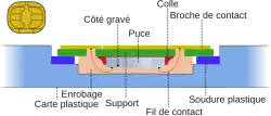 - par contact : l'interface entre les contacts de la puce et ceux du lecteur est le circuit imprimé doré très mince appelé micromodule. Il est divisé en 8 parties, chacune ayant un rôle précis permettant l'échange des données entre la puce et le lecteur. La puce est quant à elle située sous ces contacts et donc « cachée », c'est à tort que l'on désigne le micromodule comme une « puce » ;