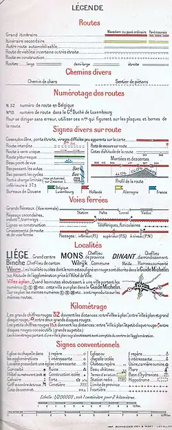 En contrepartie de ces fortes réductions elles doivent avoir recours à des signes conventionnels (viabilité et largeur des routes, péages, sites et monuments remarquables, agglomérations, chevrons de pentes...) les plus lisibles et intuitifs possibles et répertoriés dans une légende (de).